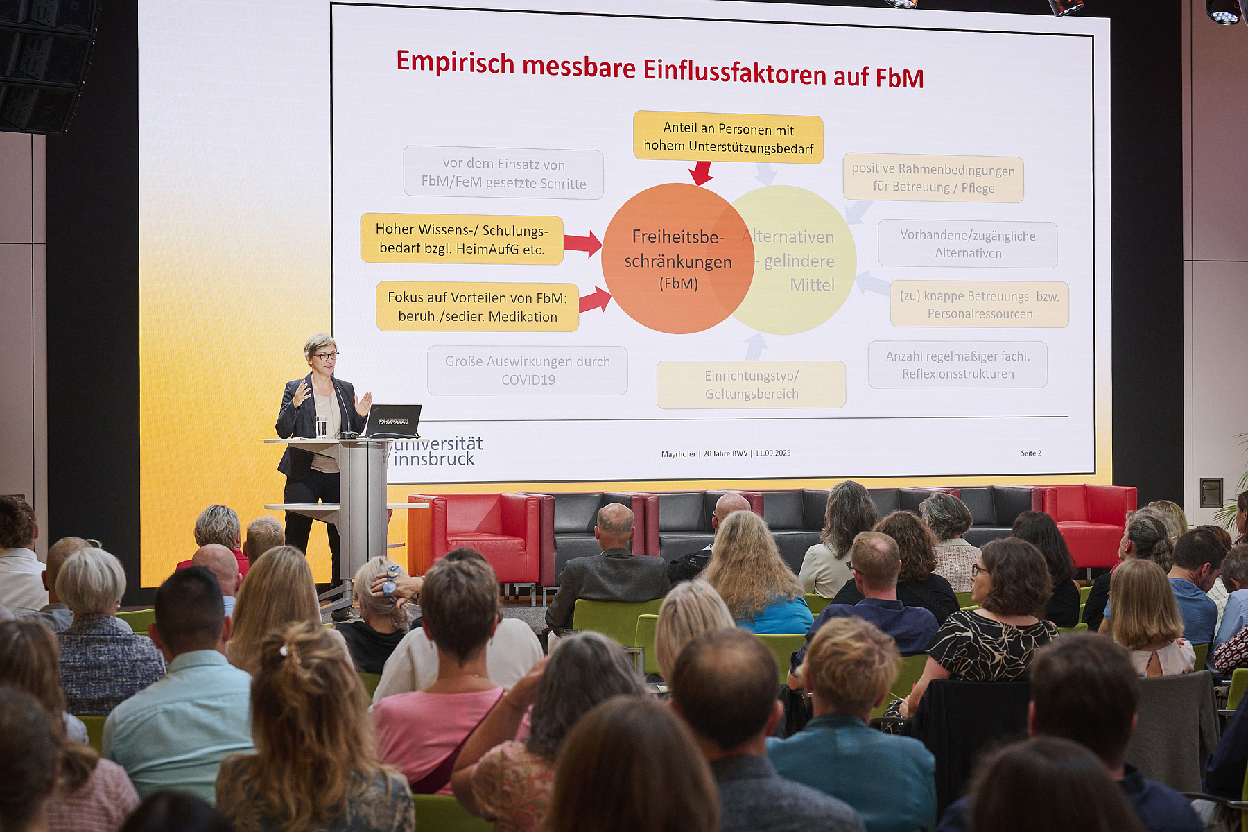 Hemma Mayrhofer, Assistenzprofessorin am Institut für angewandte Rechts- und Kriminalsoziologie skizzierte in ihrem Fachvortrag die Forschungsergebnisse zur Anwendungspraxis des Heimaufenthaltsgesetzes. Die Ergebnisse des Projekts FRALTERNA bestätigen, dass Wissen und Haltung des Personals eine große Rolle spielen, wenn es um den Einsatz von Freiheitsbeschränkungen geht: Je mehr Wissens- bzw. Schulungsbedarf die anordnungsbefugten Personen im Bereich HeimAufG und damit verbundener Themen haben, desto höher ist der Anteil an beschränkenden Maßnahmen. Insgesamt sei das Heimaufenthaltsgesetz ein sehr effektives Gesetz.